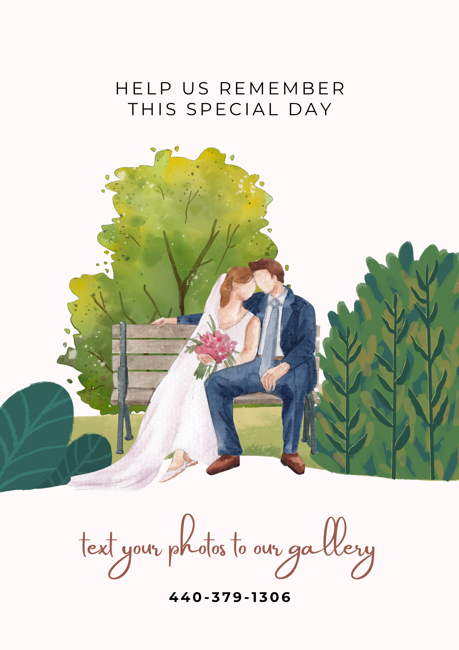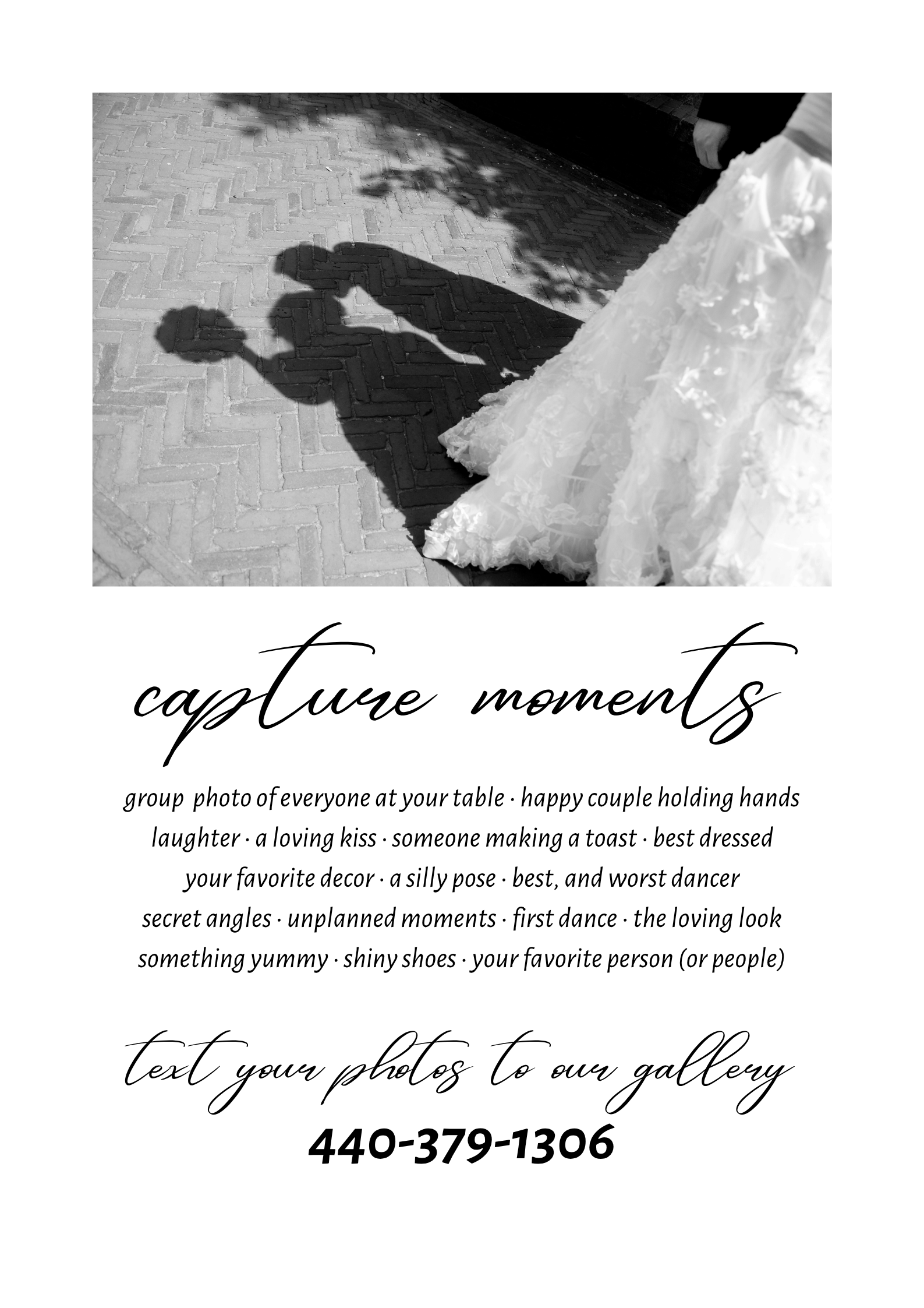 Here's what happens: Your guests are excited, maybe a little nervous, possibly distracted by logistics or finding their seats. You say, "Text photos to 555-555-0122." Some people hear it. Most don't fully process it. Nobody writes it down.